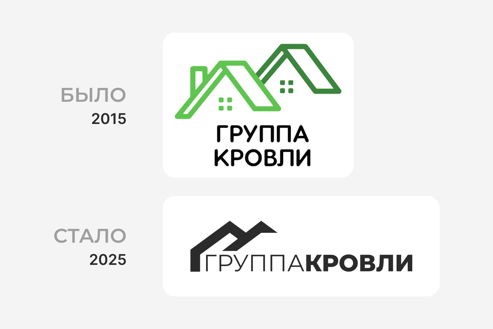 Компания «ГРУППА КРОВЛИ» начала свою работу в 2015 году с небольшой команды единомышленников. Первый логотип, созданный в год основания, отражал наши ценности — надёжность и экологичность.
